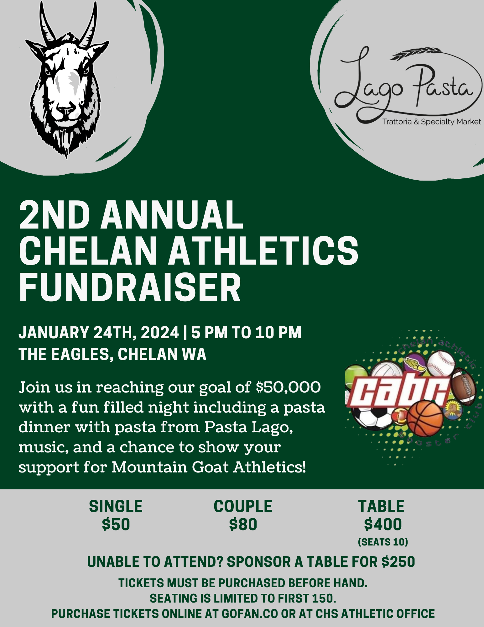 Chelan High School Athletics is teaming up with the Chelan Athletic Booster Club to hold the Chelan Athletics Pasta Feed at The Eagles with pasta donated by Pasta Lago . The Pasta Feed has been organized in order to raise money to better equip our athletic programs and facilities.