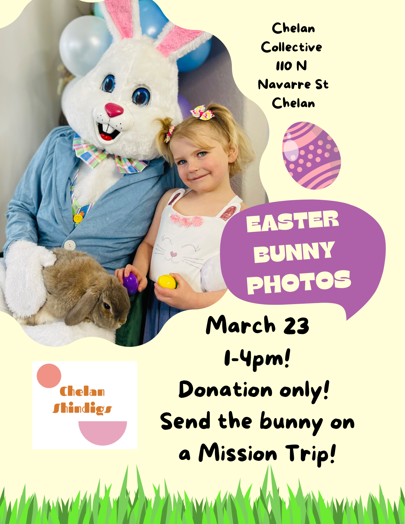 Come get a photo with the Easter Bunny at Chelan Collective from 1-4pm! You will go home with a photo and fun Memories! Donation only! Send this Bunny on a mission trip to Alaska!