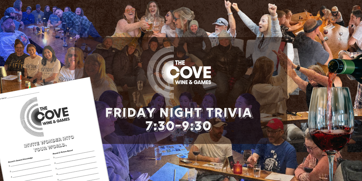 Join us at The Cove Wine & Games for Trivia night every Friday from 7:30-9:30! Enjoy a fun evening after a long work week filled with brain teasing questions, friendly competition and great prizes. 👏