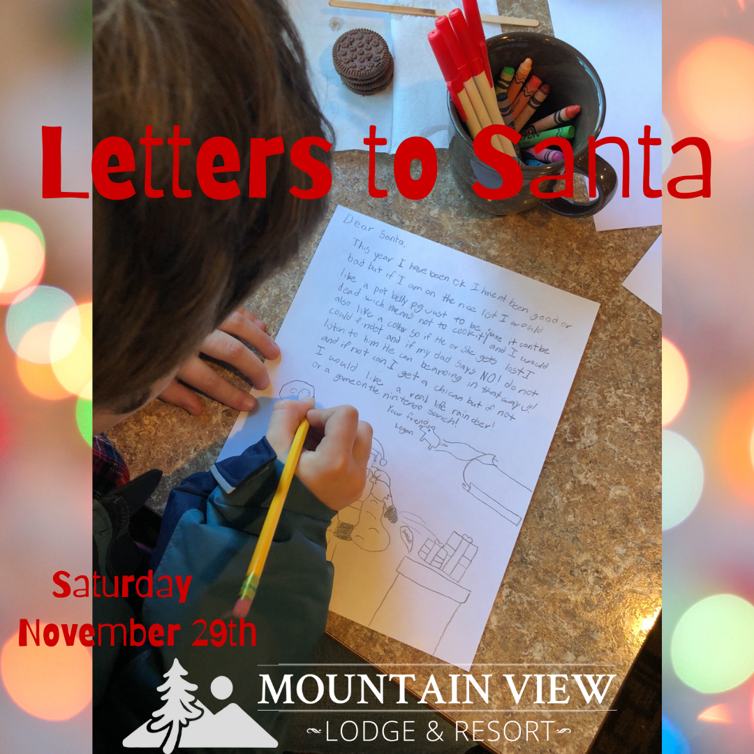 Join us at the Mountain View Lodge as we write our letters to Santa before he arrives in our town. We will have Santa letter templates, crayons, pencils and envelopes for writing all those special things you want Santa and Mrs. Claus to know about. There will be cocoa, tea, and candy canes available, a photo backdrop to take those sweet holiday pictures in front of, and the Grinch, Elsa, Olaf, or some elves will make an appearance!