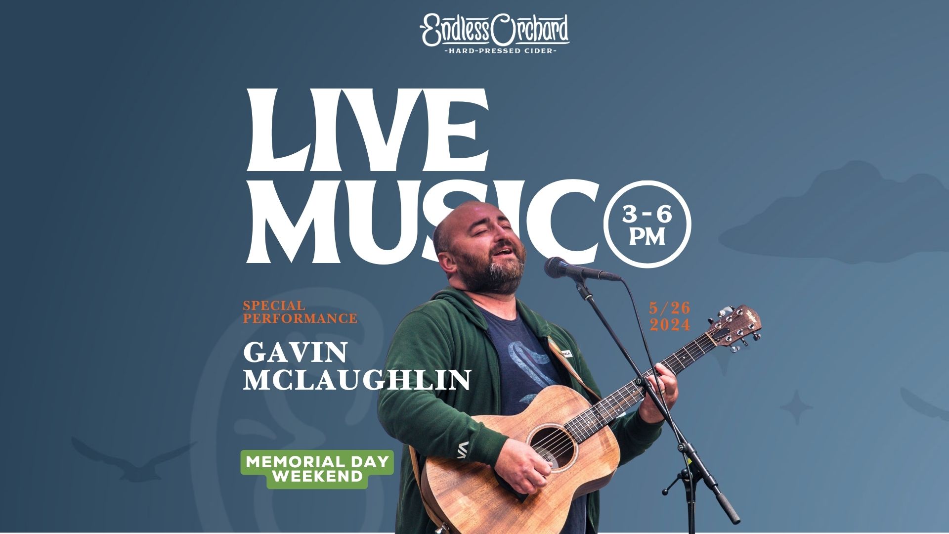 Join us for an afternoon filled with live music and good vibes at the Endless Orchard Tasting Room, where you can enjoy a variety of delicious ciders while tapping your feet to the tunes of Gavin McLaughlin, the homegrown country boy with a passion for all genres of music!