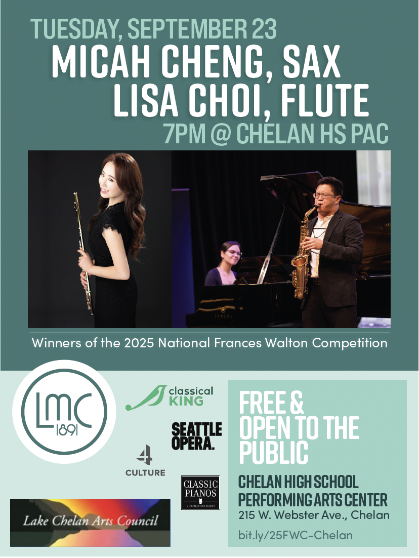 Come be thrilled by the musical fireworks of 2025 Frances Walton Competition Winners Micah Cheng, saxophone, and Lisa Choi, flute! These young classical musicians beat out top peers from across the country to win the May 2025 Competition and are excited to return to WA for this winners’ outreach tour in Central and Eastern Washington. This 1-hour concert is free and open to the public at the Chelan High School Performing Arts Center (215 W. Webster Ave). No RSVP needed!