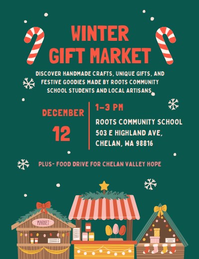 Join us for the Roots Winter Market, a festive community event celebrating creativity, hands-on learning, and the spirit of the season. Our students have been working hard on special handmade items as part of their project-based learning, and they’re excited to showcase and sell their creations. You’ll also find a variety of local vendors offering goods, treats, and gifts—perfect for holiday shopping. As part of the event, we’ll be collecting donations for Chelan Valley Hope. Please consider bringing non-perishable food items as well as new or gently used winter gear (coats, hats, gloves, scarves, boots) to support families in need in our valley. Come shop, support our young makers, enjoy the community, and give back this season!