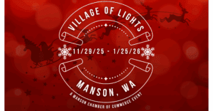 Join us as we celebrate the kickoff of our annual Village of Lights celebration on Saturday, November 29th. The day begins at Mountain View Lodge at 10:00 am where families can write letters to Santa to deliver when he and Mrs. Claus arrive via helicopter at Leffler Field at 12:00 pm. The festivities will continue as we parade down the main street of Manson following Santa and Mrs. Claus in their sleigh to light the Christmas tree. Radiance Winery and Coffee will have photo opportunities and visits with Santa following the tree lighting. Many of our businesses will be participating with fun-filled family events and warm holiday cheer from SATURDAY NOVEMBER 29TH – SUNDAY, JANUARY 25TH!