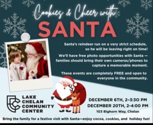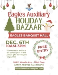 Chelan Eagles Auxiliary Holiday Bazaar!Saturday, December 6th, 2025 – 10am to 3pm in the Eagles Banquet Hall.Santa will be there from 11am to 2pmOur Christmas Bazaar is the perfect place to find unique gifts for everyone on your list!