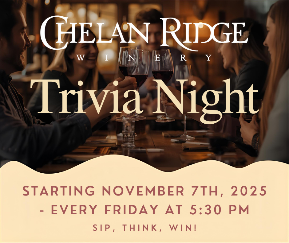 Gather your friends, sip some award-winning wines, and put your knowledge to the test at Chelan Ridge Winery’s Trivia Night! Enjoy a fun-filled evening of brain-teasing questions, laughter, and great company — all set against the stunning backdrop of Lake Chelan. Whether you’re a trivia novice or a seasoned pro, this is your chance to compete for bragging rights (and maybe a prize or two!). Our kitchen will be open with delicious food pairings to fuel your game, and of course, our signature wines will be flowing all night long.