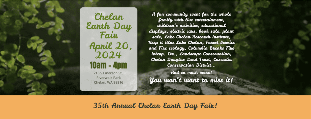 A fun community event for the whole family with live entertainment, children’s activities, educational displays, electric cars, book sale, plant sale, Lake Chelan Research Institute, Keep it Blue Lake Chelan, Forest Service and Fire ecology, Columbia Breaks Fire Interp. Ctr., Landscape Conservation, Chelan Douglas Land Trust, Cascadia Conservation District… And so much more!