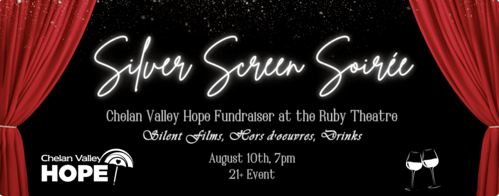Chelan Valley Hope would be honored to have you join us for an evening of fun at the Ruby Theatre! We will be showing several short films by icons like Charlie Chaplin. We are serving delicious hors d’oeuvres and specialty drinks at this 21 and over event. Dress code is summer cocktail party or feel free to dress like you are an old Hollywood star! A night of glitz and glamour for a good cause! Chelan Valley Hope provides services at no cost to all individuals and families in need, empowering people to improve their own lives. We offer a safety net for extraordinary needs. This includes assistance with housing, homelessness prevention, medical costs, food, clothing, hygiene, coats, and more. We envision a Chelan Valley where all people in need are compassionately and confidentially connected with timely relief and other relevant resources. The event will take place on Saturday, August 10th from 7-9:30pm. Tickets are $75. Thank you for supporting this amazing community!