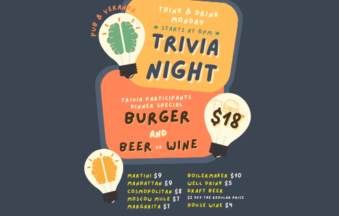 Bring your crew and test your smarts at our weekly trivia night.…