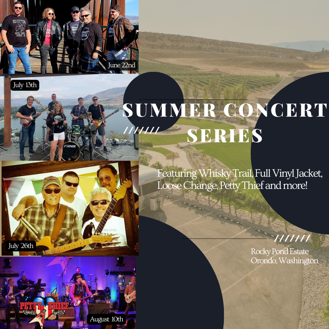 Join Rocky Pond for the Annual Summer Concert Series at the Estate in Orondo, WA! On Saturday July, 13th 2024, We are hosting the crowd- pleasing, 70s classic rock band, Full Vinyl Jacket! Featured at the 2024 Winterfest, this band knows how to ROCK! General Entry is $50. Club Member Entry is $40 (sign into your account for discount). Bring a picnic, blanket and/or low chair. (No outside Alcohol Allowed). The location of the concert will be at our estate vineyard in Orondo, Washington. Exact address details will be emailed to all ticket purchasers.