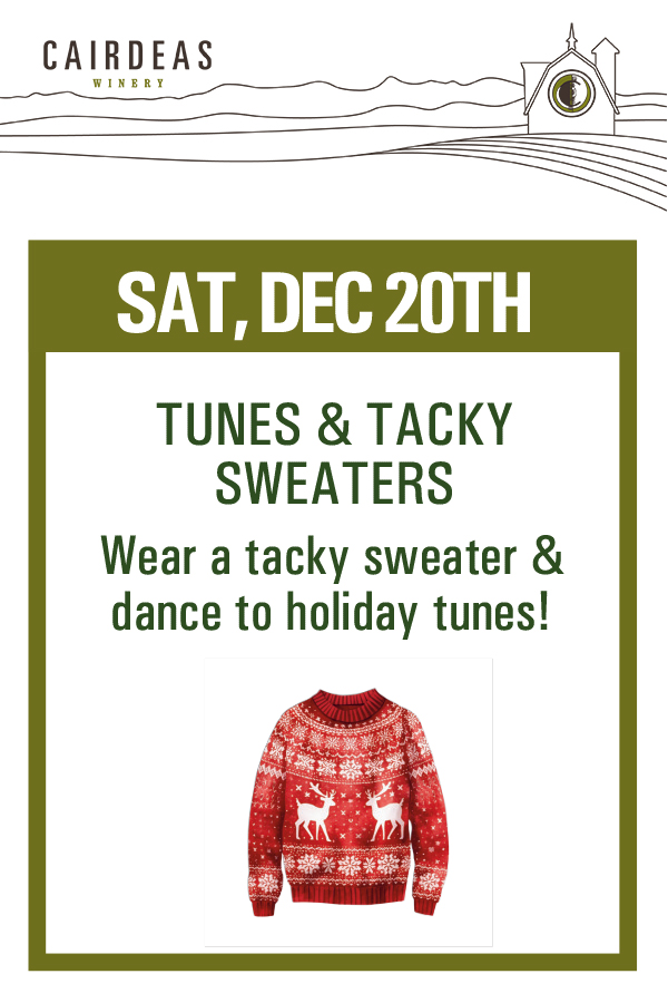 Break out your favorite tacky sweater and join the holiday fun! We’re celebrating the season with live music by "Basically" from 2–5 PM at the Cairdeas Barn in Lake Chelan. Come sip, sing along, and spread a little holiday cheer with us!