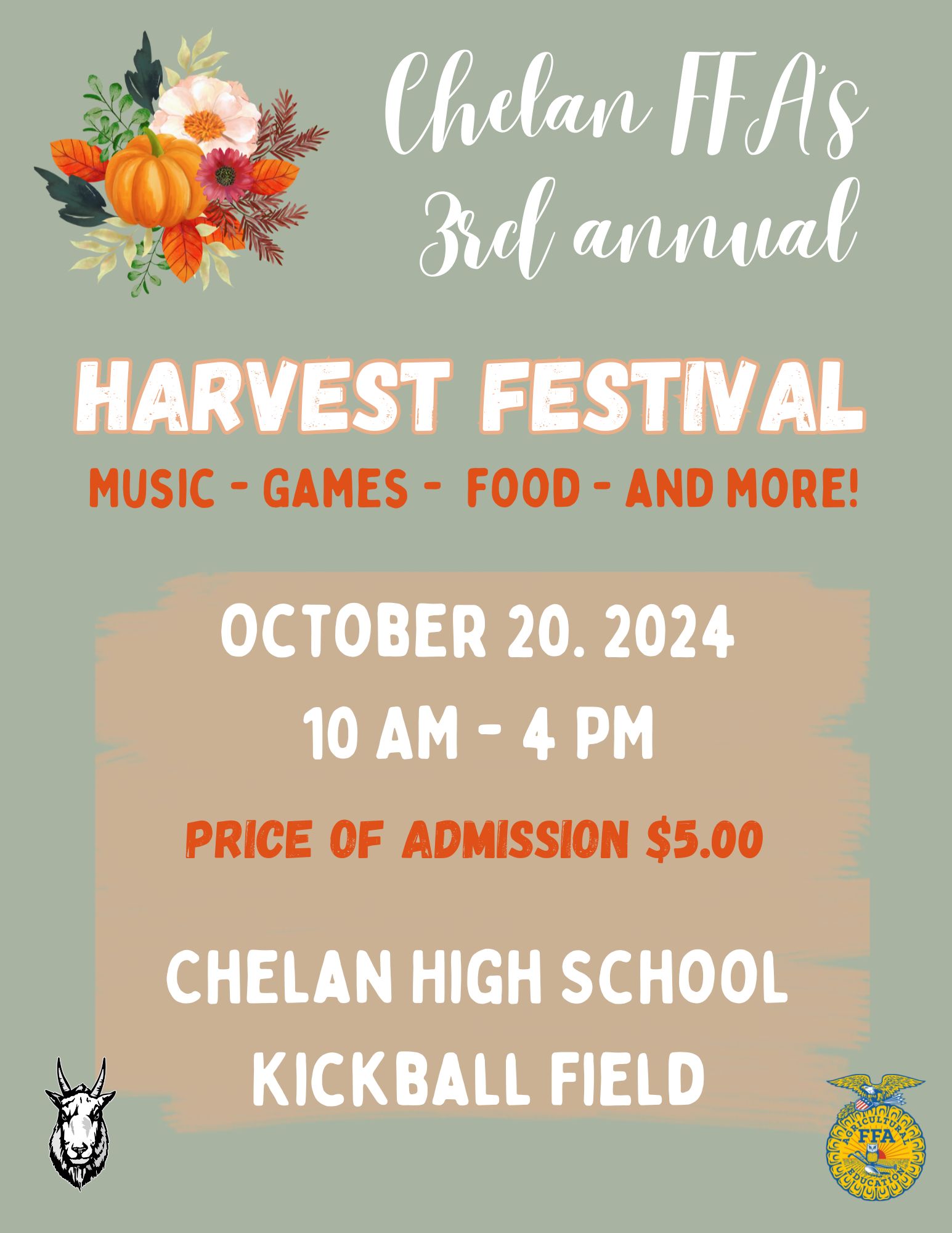 The Chelan High School FFA is putting on a harvest festival with fun and games for everyone in the family on Sunday, October 20 from 10am-4pm at the Chelan High School Kickball Field. $5 admission