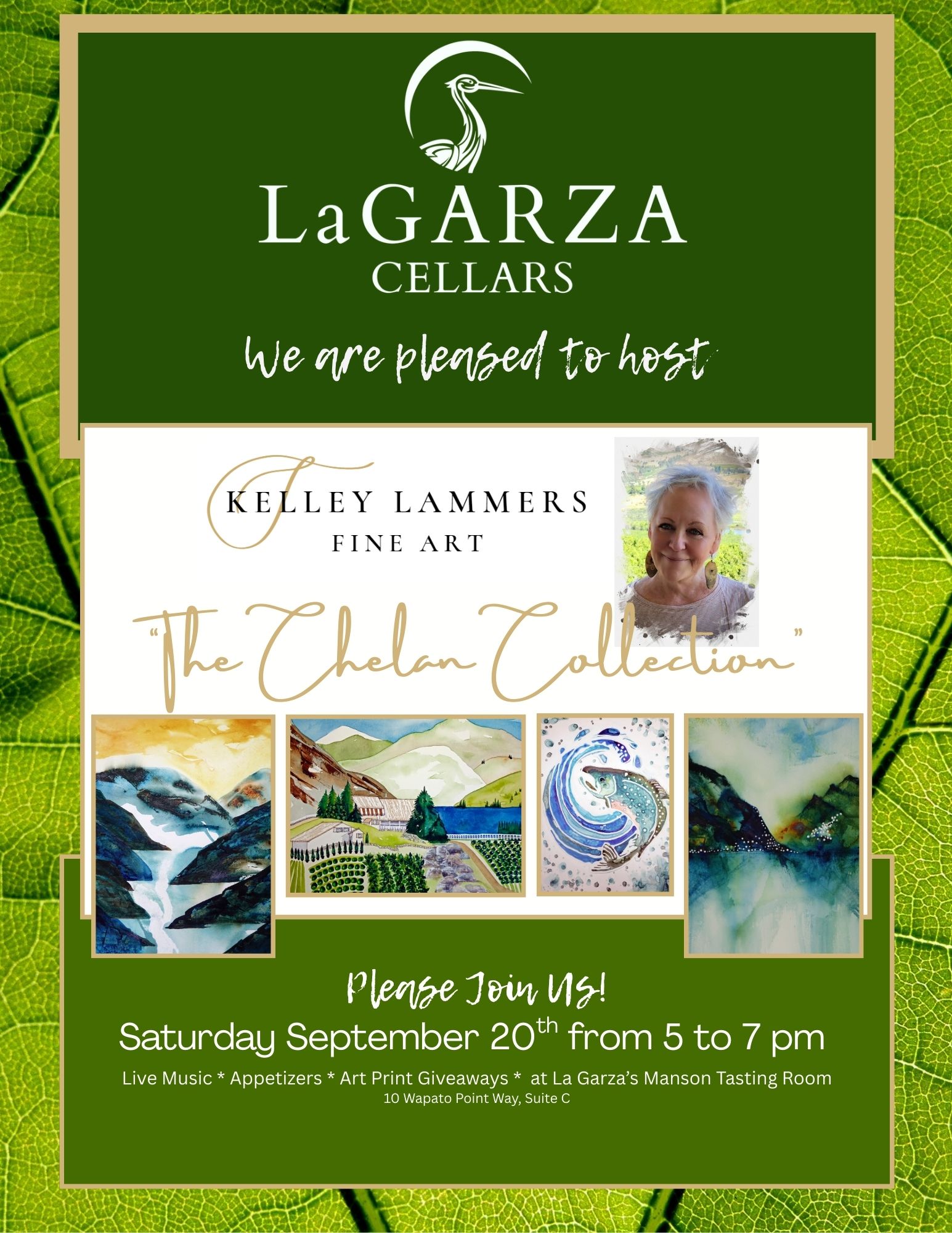 Meet local fine artist Kelley Lammers for the opening of her new series, “The Chelan Collection”. Bites and music, as well as raffles for free prints throughout the night! The collection is incredible, celebrating the unique beauty of the valley around us. Reservations not required, but encouraged! info@lagarzacellars.com