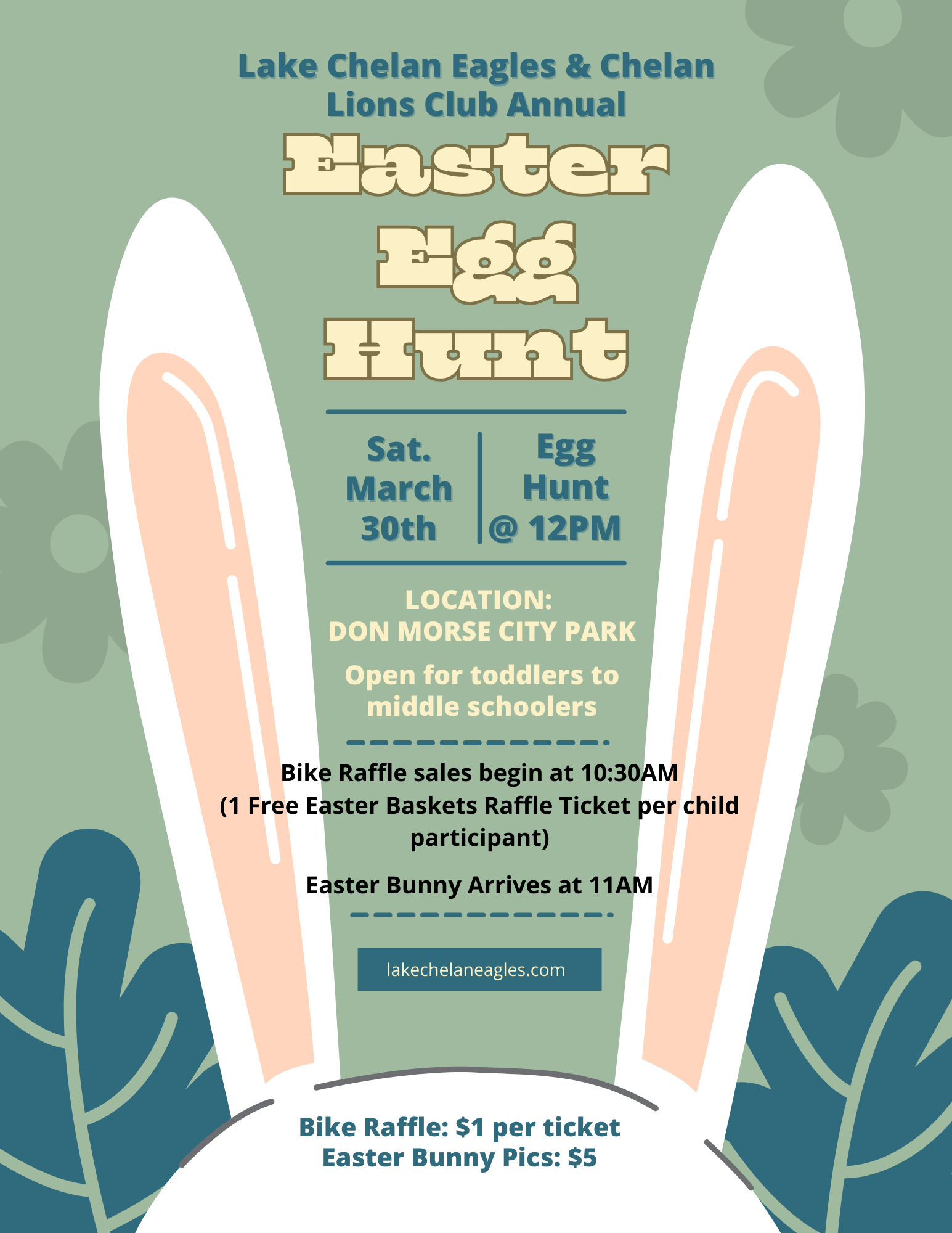 The Lake Chelan Eagles and Chelan Lions Club will be hosting the annual Easter Egg Hunt on Saturday, March 30th, 2024 in Don Morse City Park. >Toddlers to Middle Schoolers can participate >Bike Raffle sales begin at 10:30AM >Free Raffle for Easter Baskets & Stuffed Animals (1 entry per child participant) >Easter Bunny Arrives at 11AM (Pictures are $5) >Egg Hunt starts promptly at 12pm.