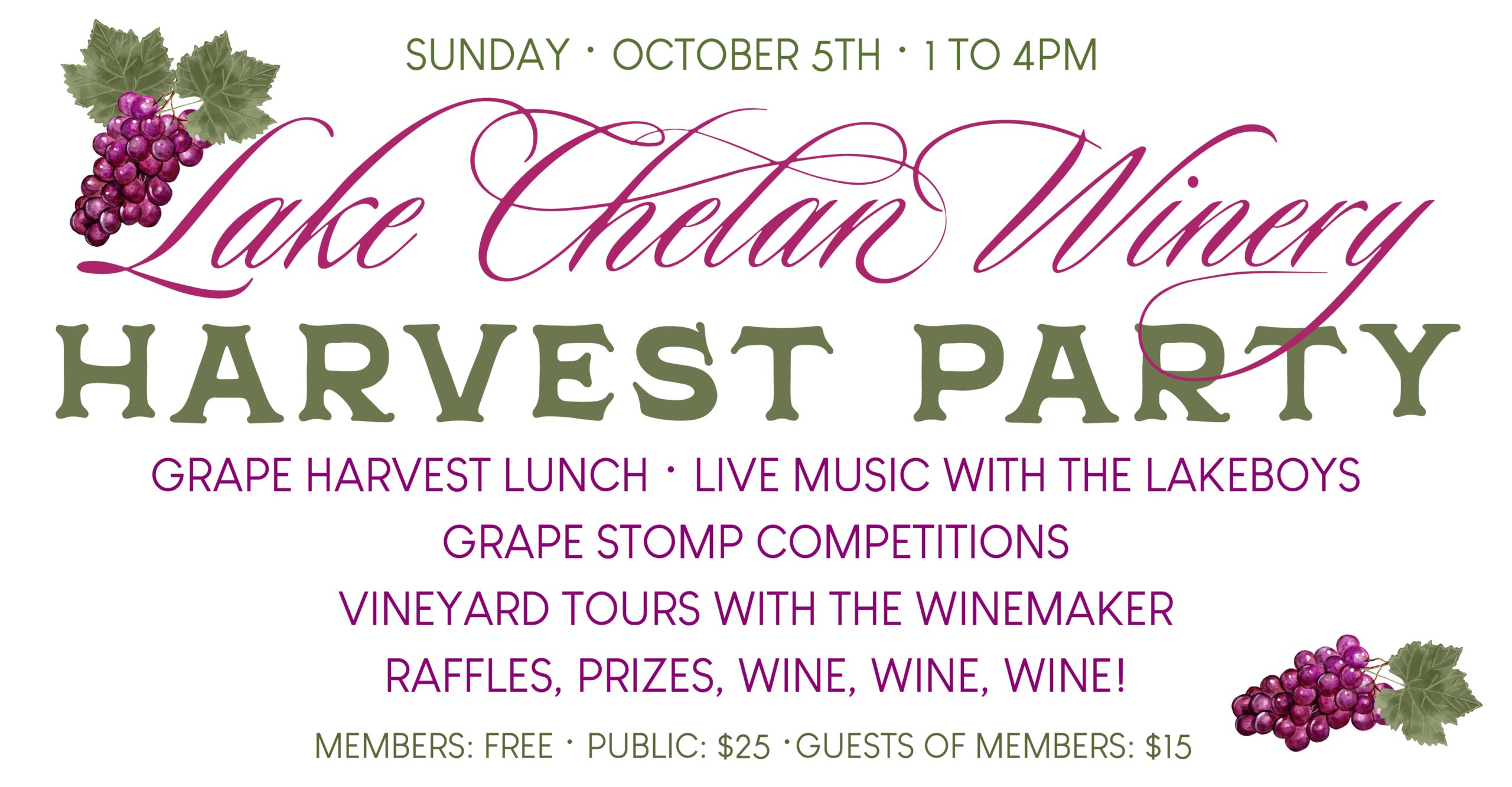🍇Celebrate Grape Harvest at Lake Chelan Winery! 📌Sunday, October 5th, 1 to 4pm 🌮Harvest Lunch 👏Grape Stomp & Vineyard Tours 🎶Live Music with the LakeBoys 🏆Raffles & Prizes ✅RSVP Today! Members: Free|Public: $25|Guest of Members: $15