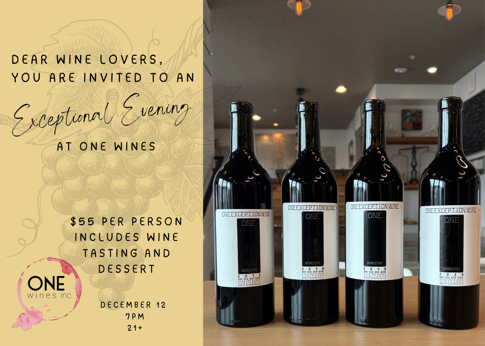 One Wines invites you to our premiere Library Night, where you can enjoy an intimate and curated wine tasting, served with a decadent dessert. Explore our expanded tasting room and savor our limited-production "Exception" Wines, usually available only to Wine Club Members. Space is limited to just 12 Guests. This Exceptional Evening will also include an opportunity to shop for holiday gifts with our featured local vendor. We look forward to seeing you there! Tickets on sale 11.24.25 at our website: https://www.onewinesinc.com/shop Ticket Price $55 per person 12 seats available December 12, 2025 7pm 21+