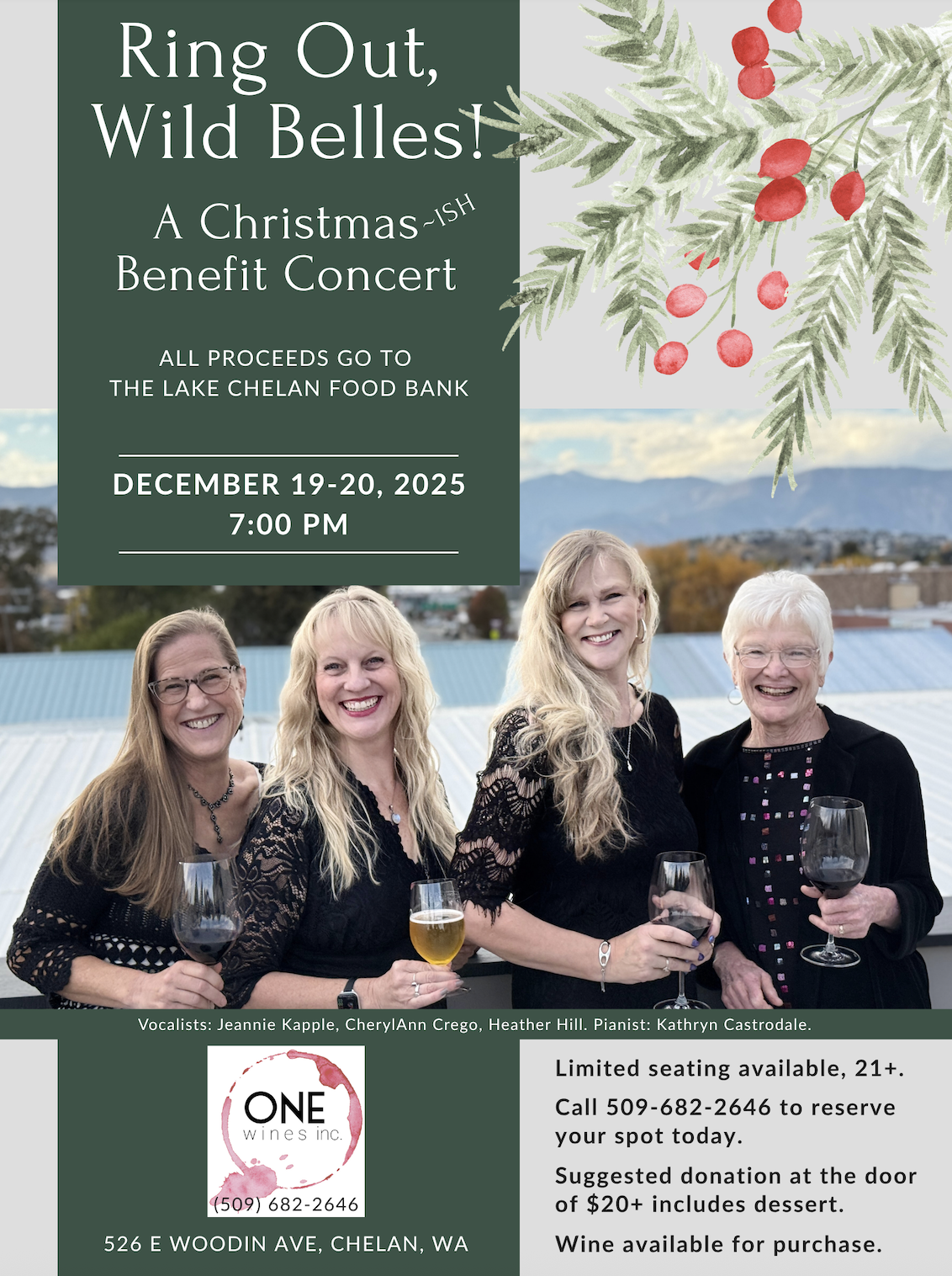 Experience One Wines’ new expanded space, enjoy a festive evening of fine wine and live holiday music, and help support Lake Chelan food bank with every ticket sold. "Ring out, Wild Belles!" A Christmas(ish) Concert brought to you by local vocalists Jeannie Kapple, CherylAnn Crego, and Heather Hill, accompanied by Kathryn Castrodale on piano, hosted by Chelan's first downtown tasting room, One Wines. This event is ages 21 and over.