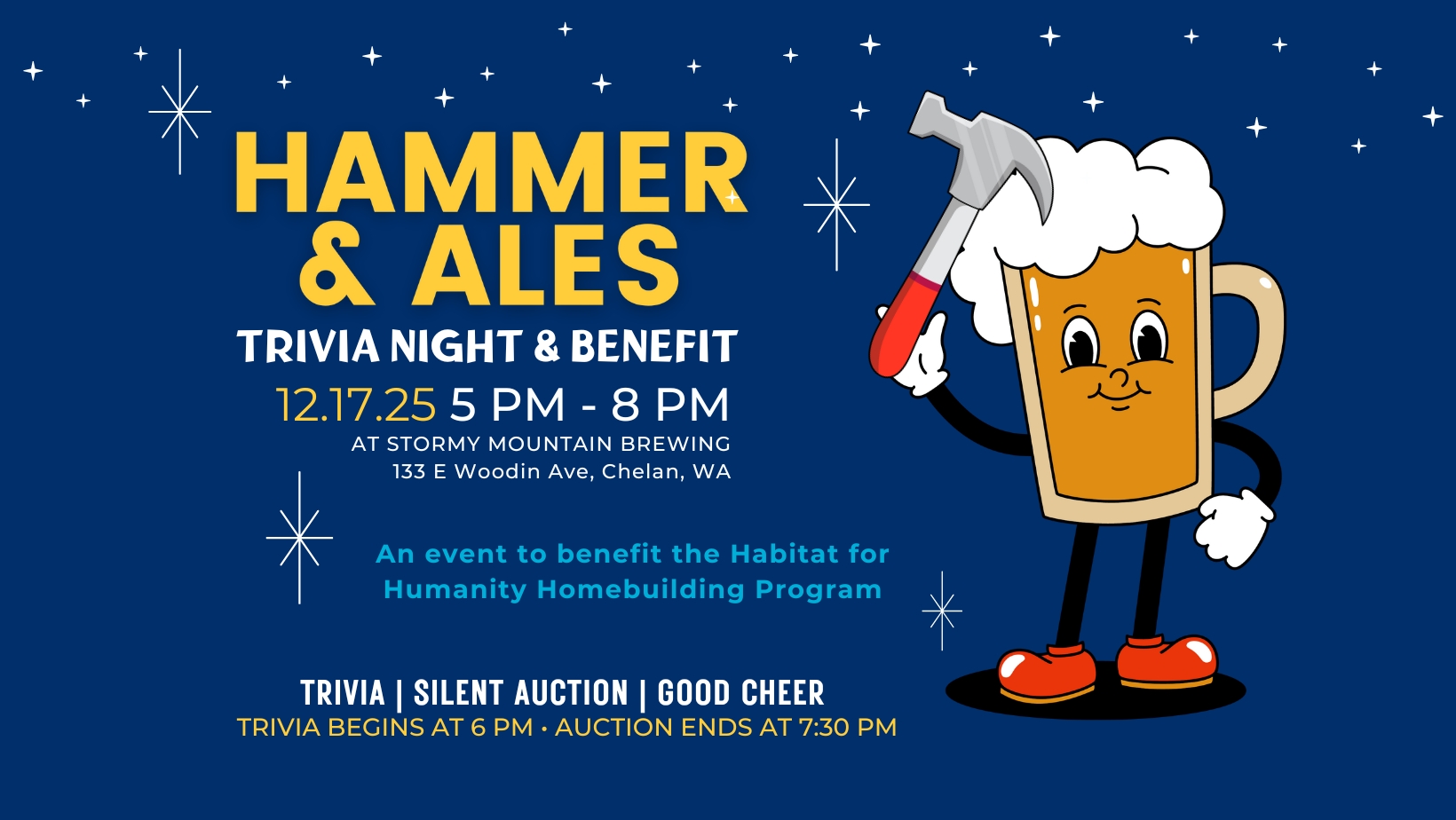 Join us for an evening of good cheer, community, and giving at the at Stormy Mountain Brewing. This festive family friendly evening will bring community members together to support a vital need in our community – the construction of affordable housing for those who live and work in the Lake Chelan Valley. Enjoy craft beer, raffles, and great company while bidding on unique items from the Habitat Store and local businesses. All proceeds help build and repair homes for families in the Lake Chelan Valley. Date: December 17, 2025 Time: 5:00pm – 8:00pm Location: Stormy Mountain Brewing, 133 E. Woodin Ave, Chelan, WA What to Expect Get ready for holiday-themed trivia, delicious brews, and plenty of surprises. Whether you’re a trivia pro or just in it for the laughs, this night has something for everyone. Featuring Holiday-Themed Trivia — fun, challenging, and full of seasonal joy. Trivia begins at 6pm! Raffles Every Round — win unique items, local goodies, and Habitat Store treasures Silent Auction — featuring unique finds, themed baskets, and gifts from local businesses. Bidding ends at 7:30! Community, Connection, and a Night of Giving Team Registration (Recommended!) Register your trivia team of 4–6 players in advance. Space is limited and […]